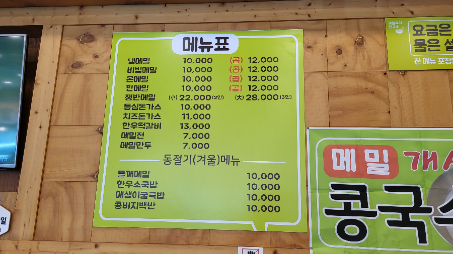 추가주문은 어려운 상황이었기에 냉메밀, 비빔메밀, 판메밀, 등심돈가스, 메밀 전, 콩국수까지 시켜서